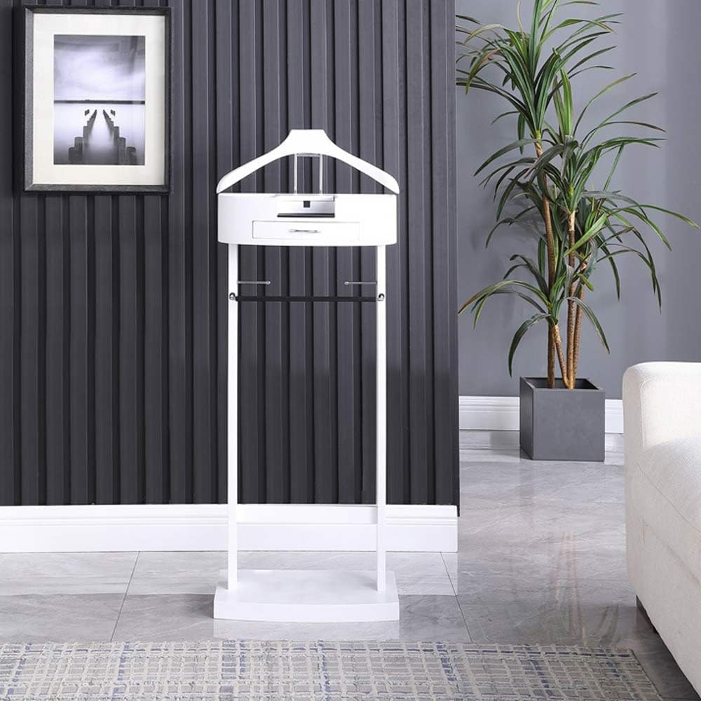 1. Crafted from durable solid wood for a natural and eco-friendly option.2. Includes drawers and trays for convenient storage of keys, watches, belts, and ties.3. Features exclusive hangers for suits to keep clothing wrinkle-free.4. Equipped with a bar for organizing belts and ties.5. Sturdy chassis designed for storing shoes securely. Product Details:Color Options: Brown or WhiteMaterial: Solid wood, MetalDimensions: 43cm L x 33.5cm W x 107cm HWeight: 13.6 pounds (6.2 kilograms)Package Contents:1 x Suit Hanger RackIdeal for Use in:Bedroom, Office, Bathroom, Living RoomAt Our Company, we are dedicated to offering top-quality products and ensuring exceptional customer service for an outstanding user experience!