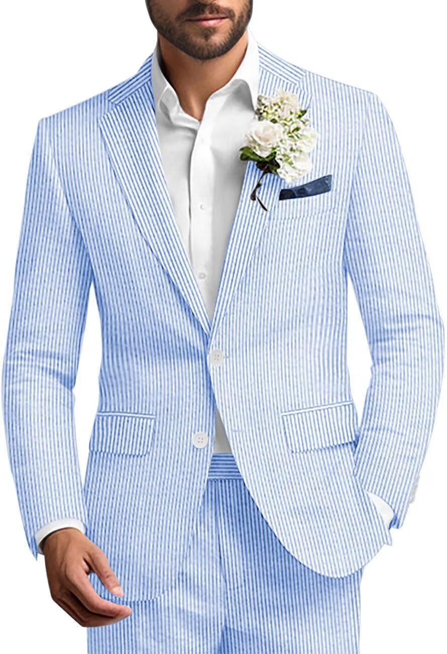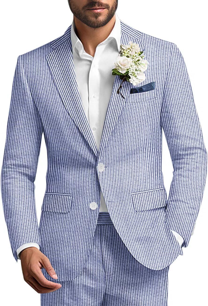 Brand: SPTALLFITJSV Title: SPTALLFITJSV Mens Seersucker Suit 2 Piece Striped Lightweight Blazer Jacket and Pants Beach Wedding Prom Suits Summer Wear Fit Type: Slim Fit Blazer Type: 2 Button Closure, Single Breasted, Notched Lapel, Side Vents Pants Type: Two Side Pockets, Two Hip Pockets, Zippered Fly Occasion: Beach Wedding or other Weddings, Prom, Party, Business, Dating, Dinner, Birthday, Festival, Celebration, Banquet, Show, Dancing Notice: 1. ABOUT COLOR: Computer screen has chromatic aberration, especially between CRT screen and LCD screen, color difference can not be avoided, so please understand that point. 2. ABOUT SIZE: Please choose the size that suits you based on your chest and waist measurements. Please ensure that the chest circumference of the jacket is 2-3 inches larger than your actual body chest circumference to leave space. If you are unsure about the size, we strongly recommend that you inquire first.
