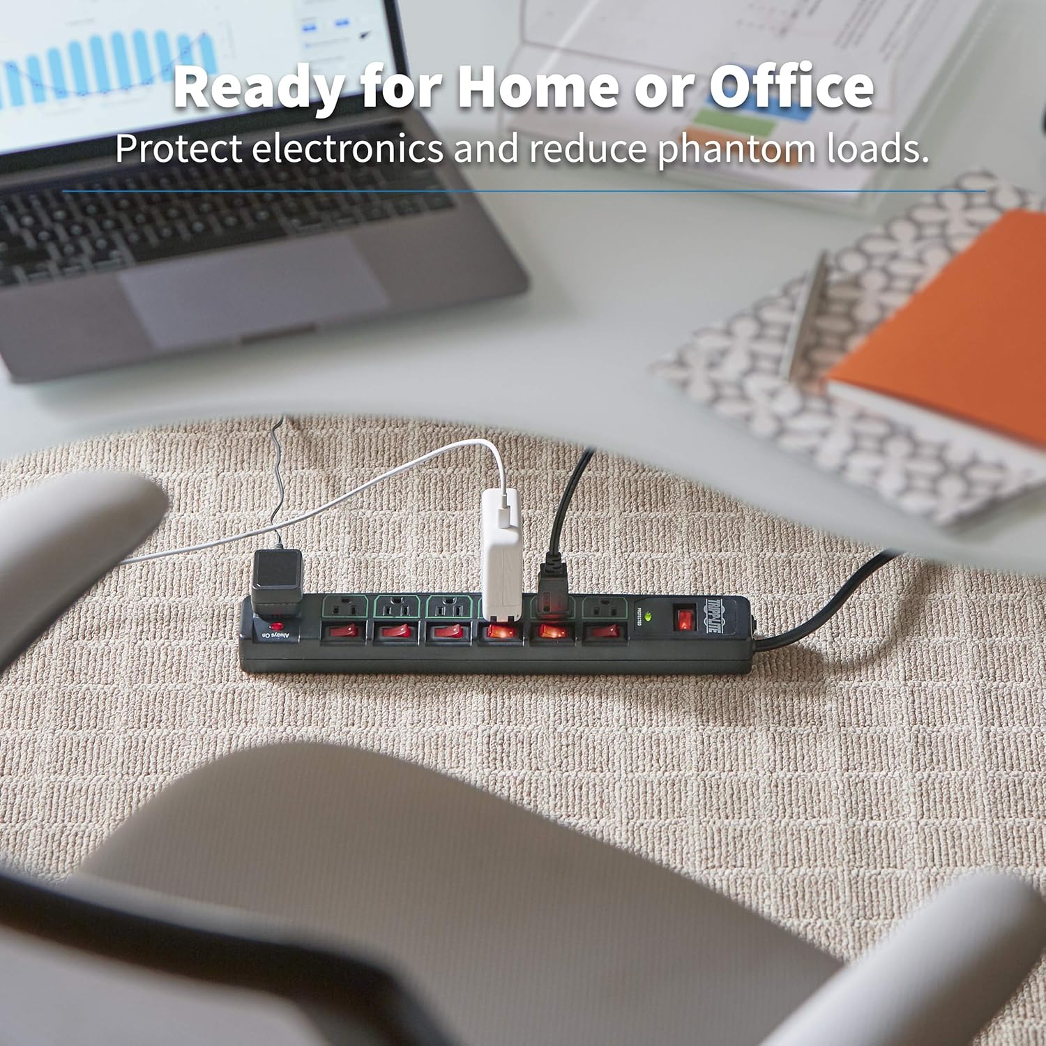 The TLP76MSGB ECO-SURGE 7-Outlet surge protector protects more than just your vital electronics. It's an ideal Green protection solution for your bottom line and the environment. Its energy-saving outlet configuration reduces waste (and costs) by cutting AC power to devices that aren't being used. One NEMA 5-15R outlet is always on for a device that requires constant power, such as a router or DVR. The other six NEMA 5-15R outlets have individual on/off switches, so if you aren't using the device plugged into it, you can power off the outlet to save energy. Another illuminated on/off switch provides one-touch control to all outlets except the one that is always on. Recommended for your home or office, the ECO-SURGE protector Features 1080 joules to defend your components against even the strongest surges and spikes. Because residential power outlets have three wires-hot line (H), neutral (N) and ground (g)-the TLP76MSGB protects all three, covering the two protection modes: full normal mode (H-N) and common mode (N-G/H-G). It also filters out electromagnetic interference (EMI) and radio frequency interference (RFI) that can disrupt your electronics and inflict hardware damage or data loss. An integrated circuit breaker protects all outlets and automatically shuts down connected equipment in case of overload. The six-foot AC power cord with NEMA 5-15P plug allows the black surge protector to reach distant outlets. Lifetime limited warranty.