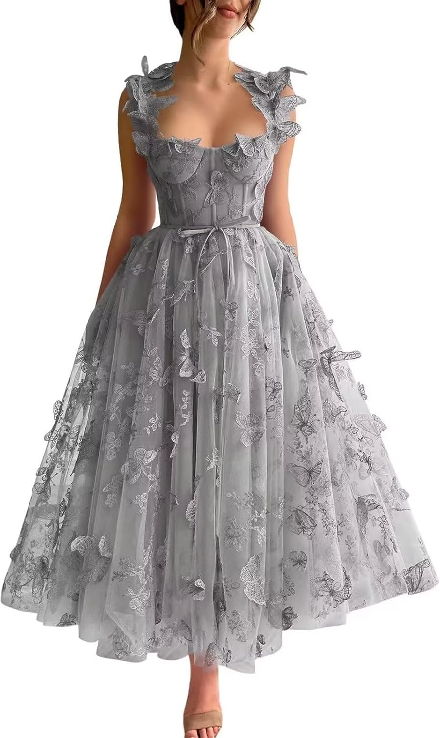 | Embellishment Feature | Prom Dress with 3D Butterflies, Prom Dress with Embroidered, formal dress with tea length |