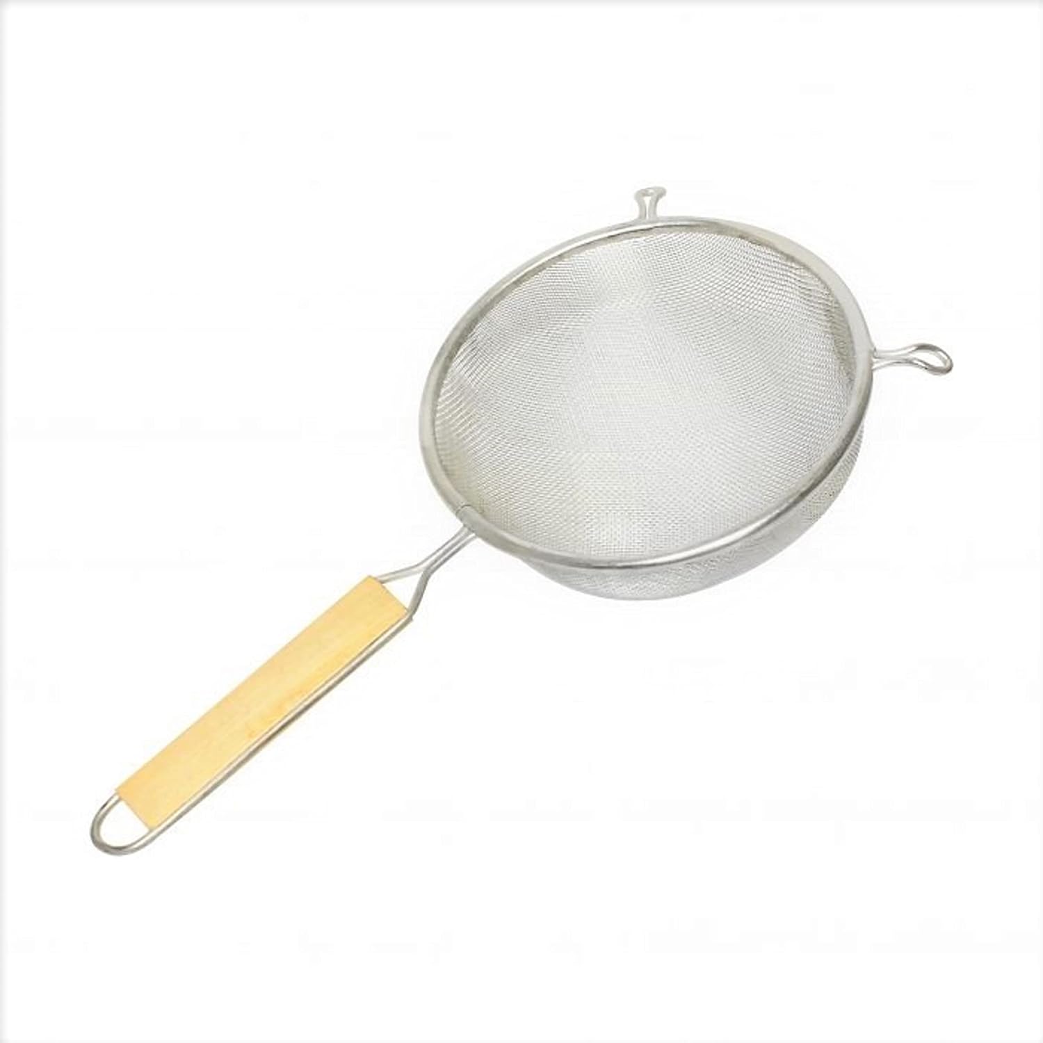 • Double layer of mesh can withstand the pressure of a wooden spoon pushing solids through. Take advantage of its mesh design to sift flour and sugar, or dust powdered sugar over your pies, cakes, and cookies. Stainless steel material, wood handle, and convenient pan hook. A hanging hole on the handle makes it easy to hang this strainer around the kitchen so you always have it close at hand.