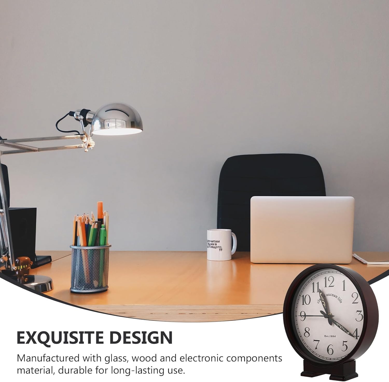 Package List 1 x desktop decorative clock Characteristics -Product Info:Retro desktop clock - Material: Glass, wood, electronic components - Battery: One AA battery (Not included) Desktop Decoration - This retro clock decor is made of quality material, which is sturdy, and . - ColorBlack - The reasonable size to create a good impression and display its retro and elegant look. - Creative and retro desktop decorative clock is perfect for cafe shop, club, hotel, bedroom, living room decoration indoor decoration clock. - Suitable for using on many occasions, such as bedroom, living room, study room, office and more tabletop clock. - Combination of traditional and modern technology, it is very suitable for many furnishing styles small tabletop clock.Goods Informationclassical decorative clock This creative clock designed with delicate look, suitable for room decoration.desk table clock This artistic silent tabletop clock ornament adopts elaborate and creative shape design, made of wood, glass and electronic components material, and practical.Vintage Clock Ornament Retro and , a good gift for friends and family members
